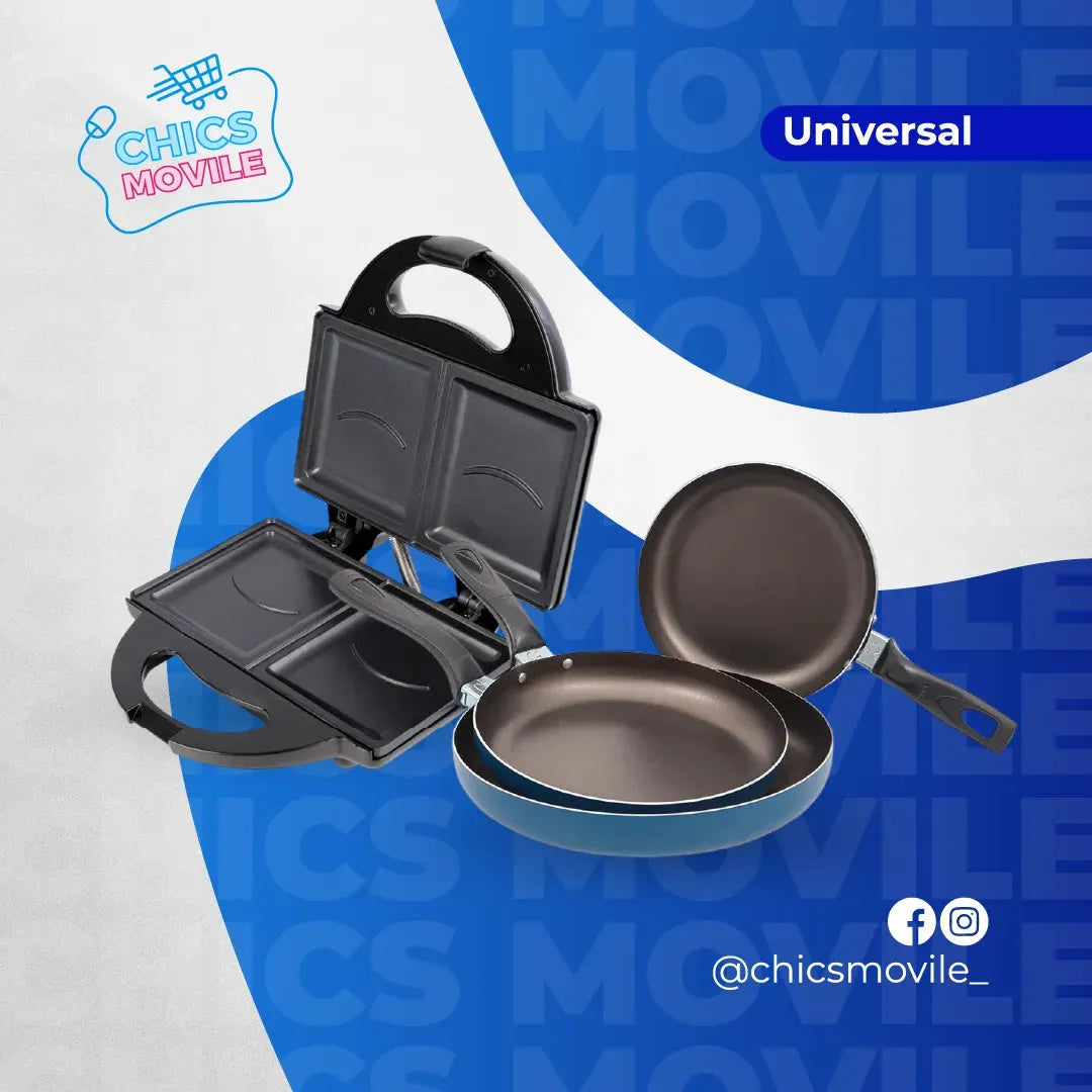Combo UNIVERSAL Sanduchera Sonrisa + Set x3 Sartenes Antiadherentes 🍳✅