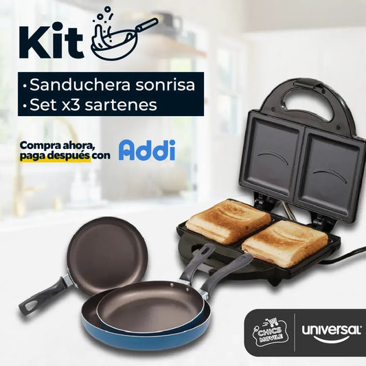 Combo UNIVERSAL Sanduchera Sonrisa + Set x3 Sartenes Antiadherentes 🍳✅